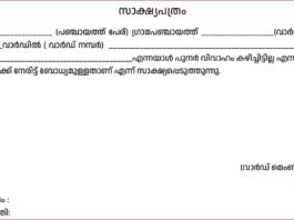 പുനർ വിവാഹം കഴിച്ചിട്ടില്ല എന്നതിനുള്ള സാക്ഷ്യപത്രം മാതൃക